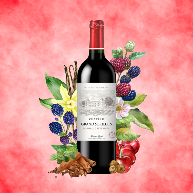 ไวน์ Bordeaux Supérieur จาก Château Grand Sorillon – กลิ่นผลไม้แดงสุก รสเข้มกลมกล่อม บ่มบางส่วนในโอ๊คเพื่อความลึก เหมาะสำหรับมื้อเนื้อพิเศษ